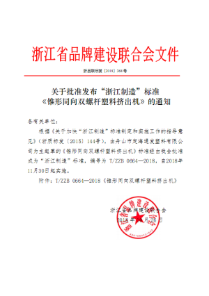今年10月,我公司自主研发的“锥同双”品牌的“锥形同向双螺杆挤出机”被列入“浙江省...